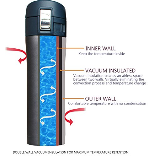 - EASY TO CARRY ON THE GO - Spill proof lid keeps your drink safely inside, and the leak proof bottle shape allows the bottle to easily fit into your cup holder! Plus, the double walls prevent condensation, so your fingers stay dry. Making this stainless steel water bottle thermos a must have accessory for the gym, work, car, hiking, camping, outdoors, yoga, crossfit, tennis, the beach, picnic, and travel.