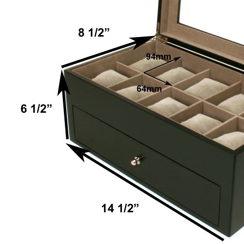 - Feature : Montego Valet for Watches, Pans Jewelry Box Black Matte Finish / XL Extra Large Watch Compartments to Fit Mens and Ladies Watches (Fits Watch Cases Up To 64mm) / Lower Drawer for 4 Pens, 10 Jewelry rolls and 2 Large Divided Spaces / Interior Lined with Charcoal Grey Colored Suede and Lucite Display Window / Valet Case Dimensions: 14" L x 8 1/2" W x 6 1/2" H
