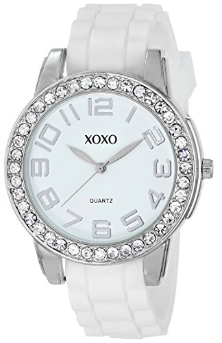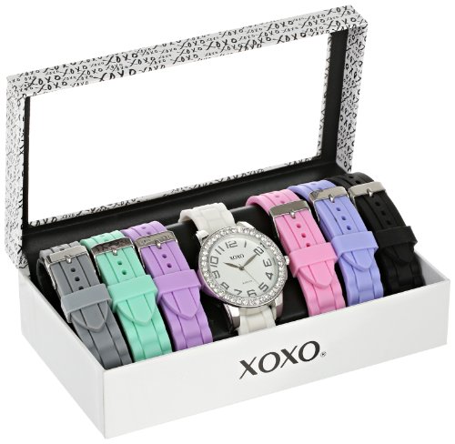 XOXO Women's Analog Watch with Silver-Tone Case, Crystal-Inset Bezel, 7 Interchangeable Bands Included - Official XOXO Woman's Silver-Tone Watch, Silicone Buckle Straps - Model: XO9069