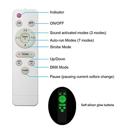 ★EASY OPERATION - The stage lighting comes with a remote control for easy operation for your club party lighting time. The buttons are made of soft silicon and can be visible on darkness spots. All functions of the stagelight can be controlled remotely, like Indicator, Power ON/OFF, Sounds activated modes (3 modes), Auto-run modes, Strobe mode, Tempo, DMX mode & Pause for shifting current colors.