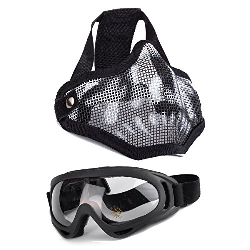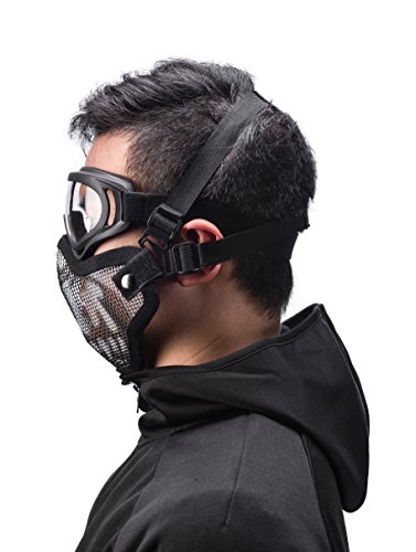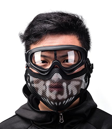 -. Feature : PACKAGE INCLUDES: 1 x steel mesh mask ,1 x tactical goggles / MATERIAL: Airsoft Mask: low-carbon steel, Goggles: ABS (Acrylonitrile Butadiene Styrene) plastic / ONE SIZE FITS ALL (Kids and Adults): The skull design is very cool,with 2 elastic adjustable elastic strap for a better fit. / LIGHTWEIGHT & FOLDABLE DESIGN: The airsoft mask can be gently bent to fit to your face better; Superb air ventilation prevents fogging from the mesh part / SUITABLE FOR A WIDE RANGE: Our PC ballistic lens can provide enough protection to BBs under 310 fps in 5 meters. Perfect for airsoft, hunting, paintball, shooting and any other outdoor activities
