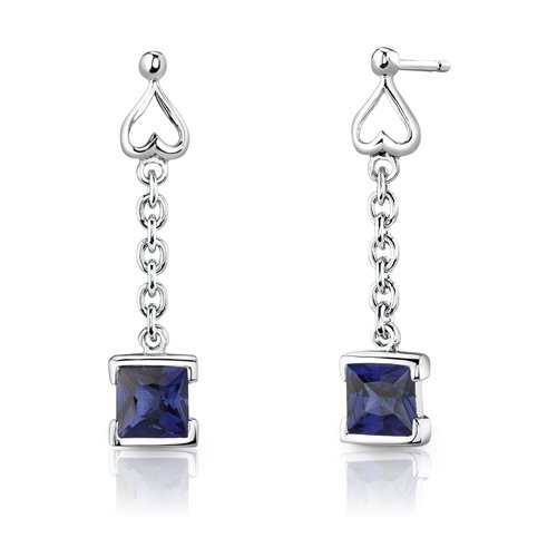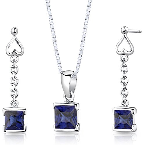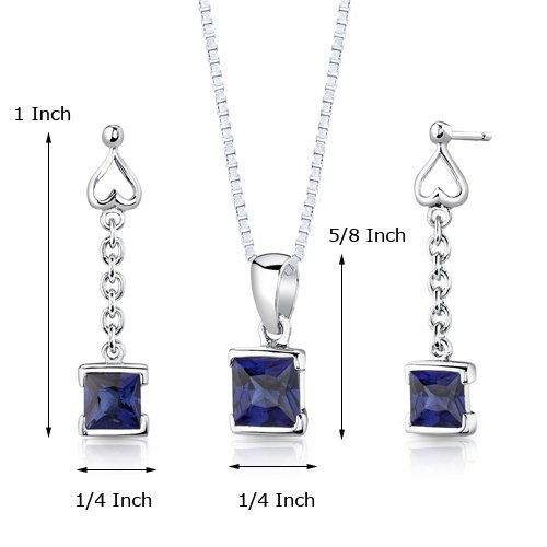 Earrings = Lab Created Sapphire, 2 pieces, Princess cut, 5.00mm. Earring Dimensions: 1 x 1/4 inches. Pendant = Lab Created Sapphire, 1 piece, Princess cut, 6.00mm. Pendant Dimensions: 5/8 x 1/4 inches. Earrings and Pendant have a total weight of 3.00 grams and are set in pure Sterling Silver Rhodium Nickel Finish with .925 stamp. Gemstones have a vibrant rich color and eye clean clarity. The Pendant and Earrings feature top quality workmanship and a beautiful finish. Includes Free 18 inch Sterling Silver Rhodium Nickel Finish Box Style Chain, Free Ribbon Gift Box.Feature