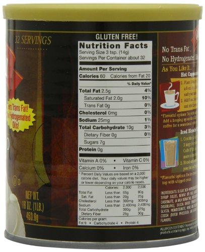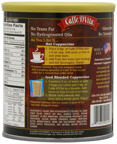 32 Servings. Delicious hot or iced! Just 60 calories, no trans fat & no cholesterol. America's favorite Instant Cappuccino. Our premium coffee and ingredients create a superior creamy, rich flavor experience you'll be proud to share with friend and family.