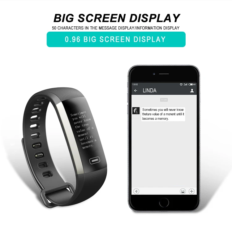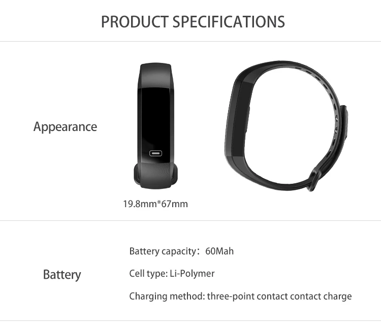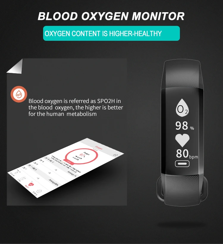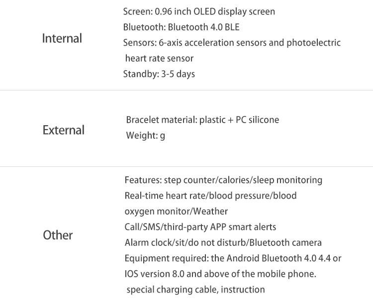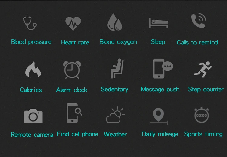 Function:Passometer,Social Media Notifications,Message Reminder,Sleep Tracker,Remote Control,Alarm Clock,Blood Pressure,Call Reminder,Blood Oxygen,Push Message