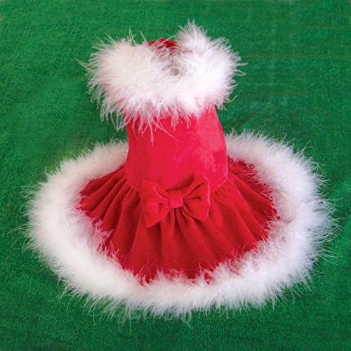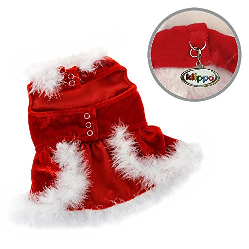 -. Binding : Misc. -. Brand : Klippo -. Color : RED -. Feature : Luxurious Christmas/holiday dog dress made of soft velvet fabric. / Accented with white boa trims around the neck and skirt. / A small D-Ring attached near the neck area to add on a "Klippo" charm or ID tag / See pictured size chart for reference -. Label : KLIPPO PET -. Manufacturer : KLIPPO PET -. PackageQuantity : 1 -. ProductGroup : Pet Products -. ProductTypeName : PET_SUPPLIES -. Publisher : KLIPPO PET -. Studio : KLIPPO PET -. Title : Dog/Puppy Christmas/Holiday/Sundress/Party/Valentine's Day/Festive/Fancy/Formal Velour with Boa Trims Dress for Small Breeds