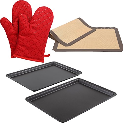 Baker's Secret Essentials 2-pc Large and Medium Cookie Sheet Value Pack, Non-Slip Kitchen Gloves for Cooking and 2-piece Silicone Baking Mats Set