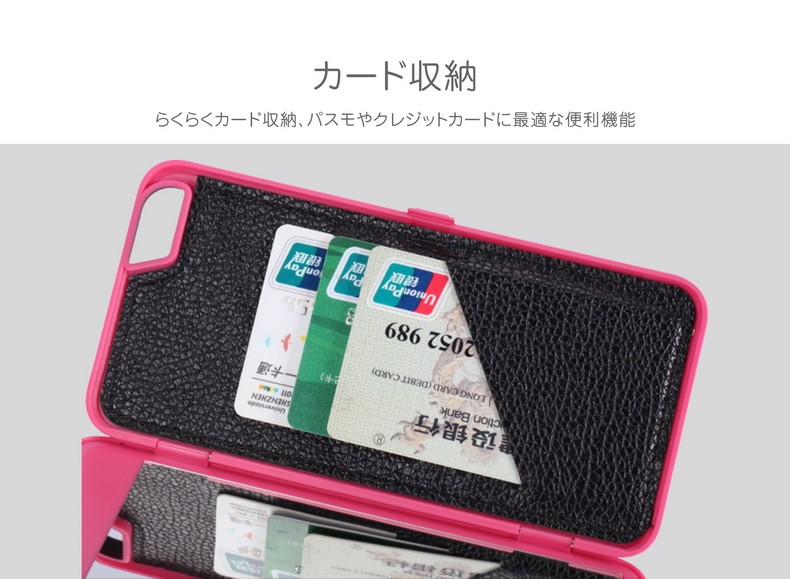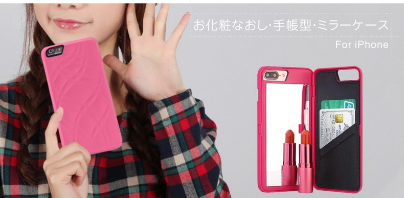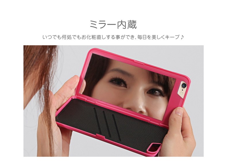 材質:TPU製品特徴:・お化粧なおしに最適、鏡内蔵ケース・個性溢れるかわいい仕上がり・便利なカード収納付き・動画鑑賞らくらく、スタンド機能・耐久性に優れたTPU素材対応機種:・iPhone6s・iPhone6※カメラ開口部は機種によって形が異なります、予めご了承の上ご購入下さい。カラー(全4色)(1)ローズピンク(2)パープル(3)ミントグリーン(4)ブラック