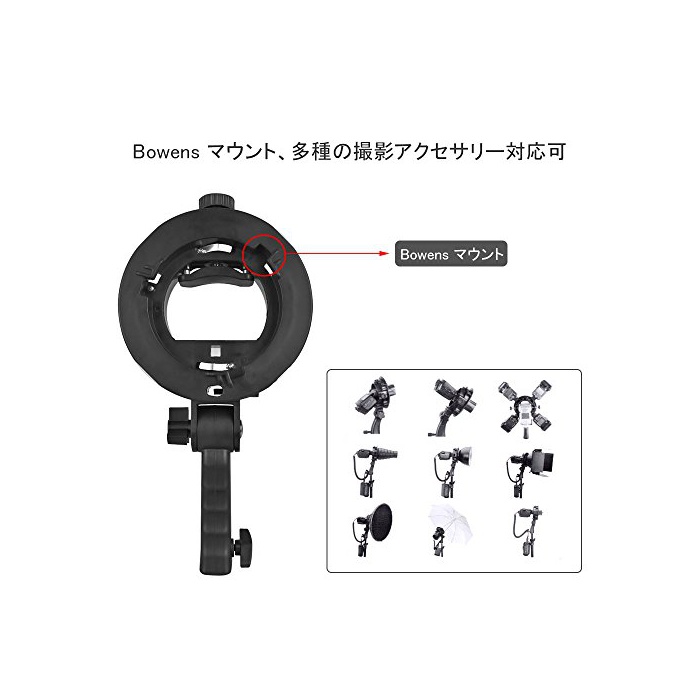 유니버설의 bow《운즈마운토》에,라이트 텐트/소프트 박스/스트로보 /플래쉬 /뷰티 (dish)디시 등 다종의 촬영 악세사리에 대응합니다.