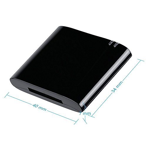 Specifications: Output: Bluetooth Support file: Bluetooth V.4.0 APTX Connector: Equipment with Apple 30-Pin Dock Transmission distance: Up to 33 feet Product Dimensions:1.7 x 1.4 x 0.3 inches Item Weight:0.3 ounces Package included:1 x Music Receiver(The dock is not included)