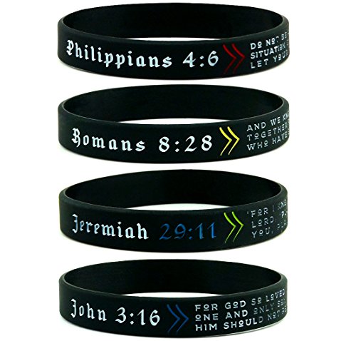 -. Feature : Set of 4 silicone wristbands with popular scriptures / Standard adult size of 8" around; Classic unisex design is suitable for both him and her / Includes the following Bible verses: Philippians 4:6, Romans 8:28, Jeremiah 29:11, & John 3:16 / Black with multi-color accents: red, yellow, green, & blue