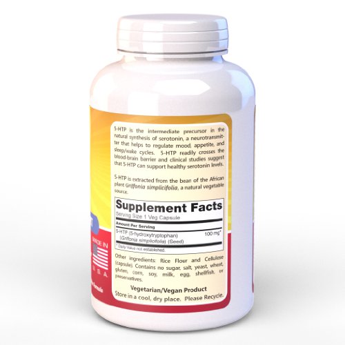 Product Description 5-HTP 100 mg comes in veggie capsules (60) for Seratonin Support. All natural way to support a positive mood. 100% Satisfaction Guarantee with no questions asked. 0