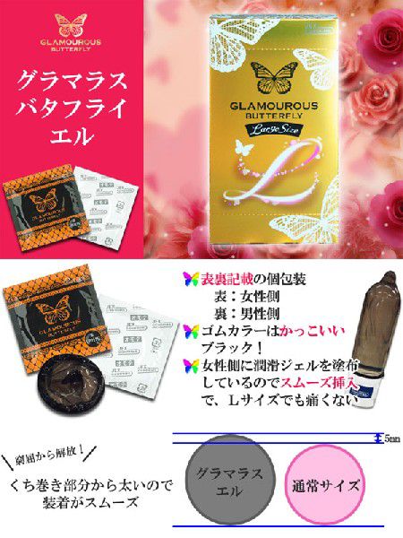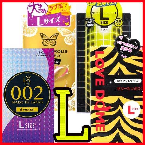 ・コンドームの適正な使用は、避妊に効果があり、エイズを含む他の多くの性感染症に感染する危険を現象しますが、 100%の効果を保証するものではありません。大き目Lサイズコンドーム【送料無料】4箱セット 各社人気のLサイズを集めました。 0.02mmの商品や北斗の拳コンドームも入っています。 【セット内容】 ■品名:イクス0.02mm Lサイズ 入り数:6個 素材:ポリウレタン 特徴:0.02ミリの薄さ、におわないポリウレタン製、ジェルタイプの潤滑剤 定価:1000円(税別) 販売元メーカー:ジェクス株式会社(製造:オカモト) ■品名:オカモト ラブドームL 入り数 :12コ入 素材:天然ゴムラテックス カラー : ピンク 潤滑剤 : たっぷりジェルタイプ 定価: 1000円 (税別) ■品名:ジャストフィットL(不二ラテックス製) 入数:1箱12個入 定価:2160円 直径:38mmのラージサイズ 特徴:たっぷりゼリー付、ゴム臭カット、オールマイティ型の脱落防止、リンクル加工で安定 ■品名:グラマラスバタフライL 入り数 :6コ入 特徴:空気を抜かずにすぐ使える、先端濃いゼリー、全体さらっとした潤滑剤 カラー:ブラック 定価:1000円 (税別)
