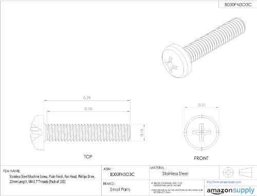 Stainless Steel Machine Screw, Plain Finish, Pan Head, Phillips Drive, 20mm Length, M4-0.7 Threads (Pack of 100)