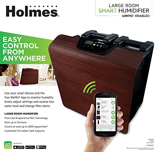 Holmes brings you a state-of-the-art humidifier with WeMo that helps you manage and maintain your home-environment from anywhere using your smart device. Easily check the humidity level, get an alert when the water is low and get reminders when the filters need changing. You can also adjust settings or schedule the humidifier's operation right on your phone to fit in with your busy lifestyle. Set-Up is easy and the app works with the entire suite of WeMo appliances.Feature