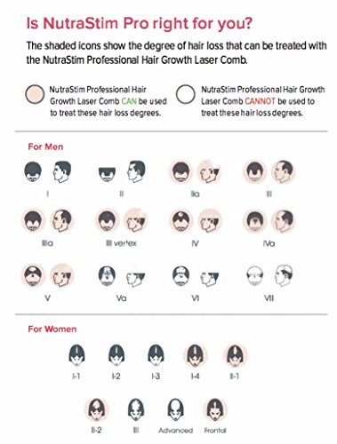 Hair loss is common among men and women, young or old; Thanks to the FDA cleared NutraStim Hair Regrowth Laser Comb, it doesn't require expensive treatments anymore! This low-level, 12-laser therapy stimulates root follicles and increases energy production to combat baldness; The treatment requires the comb to be used 3 times a week for 8 minutes; The user should start to see results in as early as 4 months, and full results in 6 months NutraStim Professional Hair Growth Laser Comb is indicated to treat androgenetic alopecia and promote hair growth in females who have Ludwig-Saving Scale 1-4, II-1, 11-2 or frontal patterns of hair loss and in males who have Norwood Hamilton Classifications IIa to V and in both who have Fitzpatrick Skin Types I to IV The Hair Laser Comb uses laser light to promote hair growth; The Hair Laser Comb uses laser light to promote hair growth; To start the process of growing new hair, simply use your hand to part your hair and apply to NutraStim to the scalp