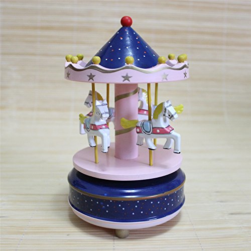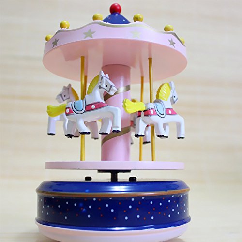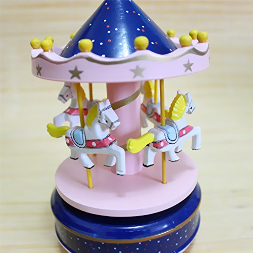 GoodPlay Carousel Music Box Wooden 4 Horses Rotating Music Box for gift Pink&Blue-Star
