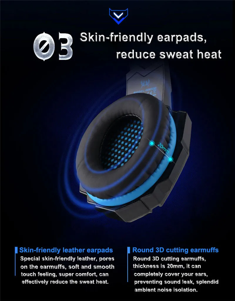 - Earmuffs used with skin-friendly leather material, and super soft Over-ear pads that is more comfortable for long time wear. Glaring LED lights are designed on the earcups, highlighting the atmosphere of the game.