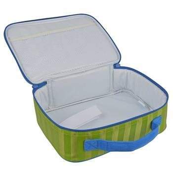 The matching Lunch box has a double zipper closure and is fully lined and insulated, making it perfect for hot or cold use. It has a velcro strap to hold a drink and a mesh pouch for separating food. There is also a front zippered pocket for extra storage.