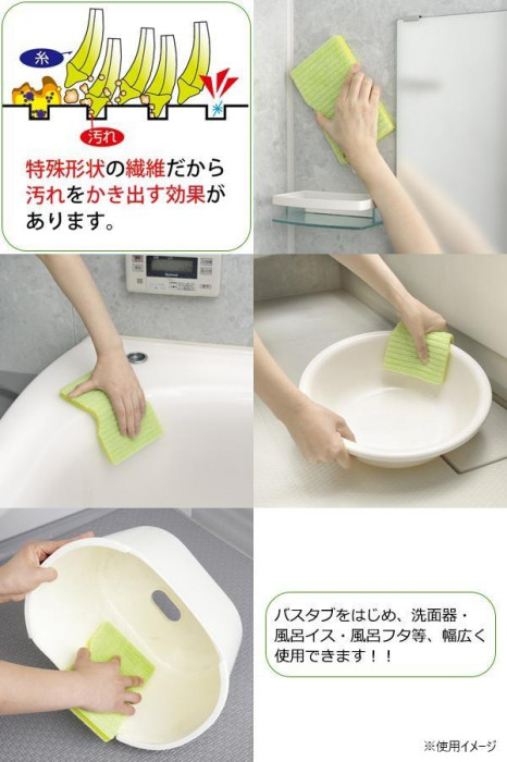 水切れがよく、乾きの早いスポンジを使用したバス用クリーナーです。繊維のもつ特殊断面形状の側面エッジングにより、水だけでカビや湯垢を落とすことができます。洗剤を使用する場合でも、ごく少量で充分汚れが落とせます!!