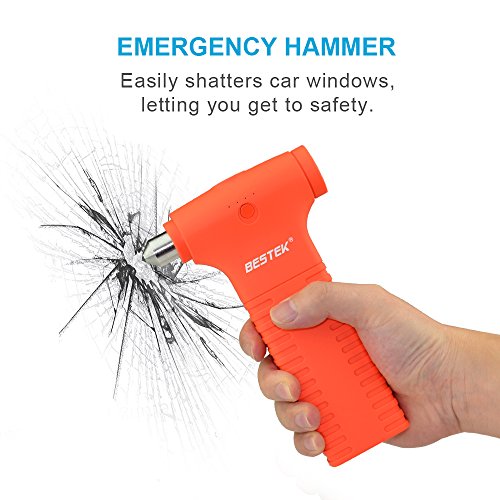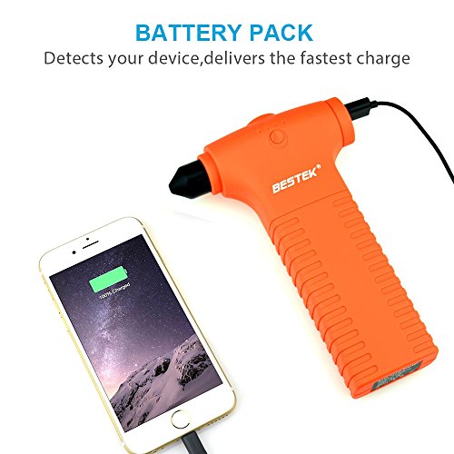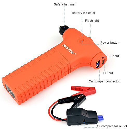 - Feature : BESTEK® Advantage:jump start your vehicle(up to 4L gas or 3L diesel engine) up to 20 times with 400 amps of peak current and heavy duty clamps and cables / Emergency Features:built-in glass shattering hammer easily punches through car windows, letting you get to safety.LED flashlight has ultra-bright, SOS and strobe modes / Portable USB Charger:with 11000mAh capacity and Smart IC technology,charge phones,tablets,or other devices at speeds of up to 2.1A via the built-in USB port.Recharges in just 5 hours with included chargers(Standby Time:6~12 Months) / Air Compressor Function:high capacity 11000mAh can supply power for your air compressor; with built-in air compressor output, enough to pump 4 tires for most vehicle and make sure the safety of car tires while traveling / What You Get:BESTEK Jump Starter, jumper cables, 15V wall charger, 12V car charger, USB charging cable,welcome guide, our fan-favorite 18-month warranty and friendly customer service
