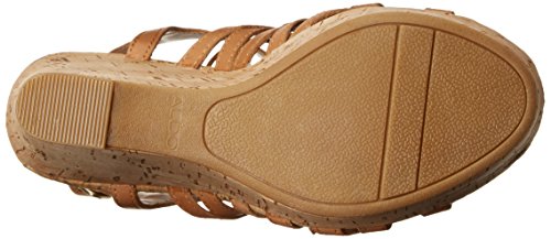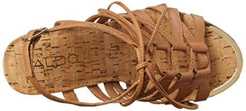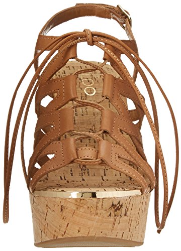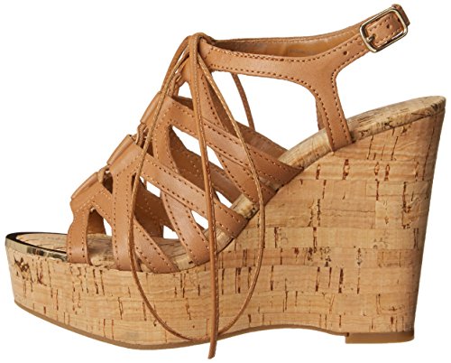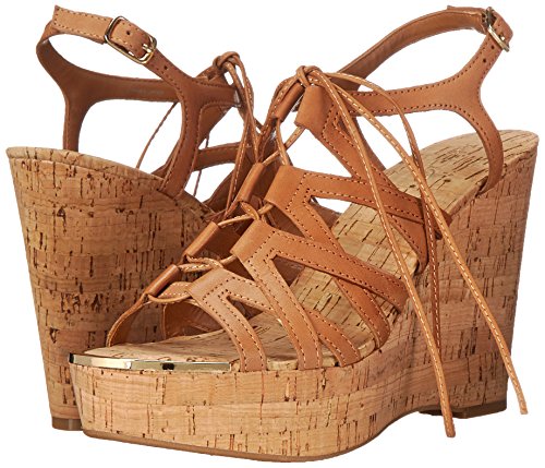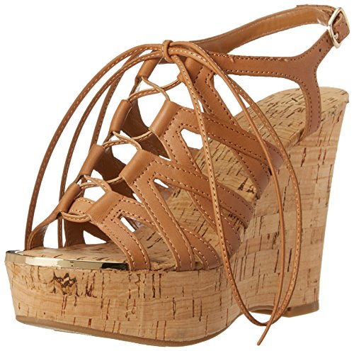 Strappy sandal with faux-cork wedge featuring lace-up vamp and metallic inset at toe