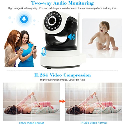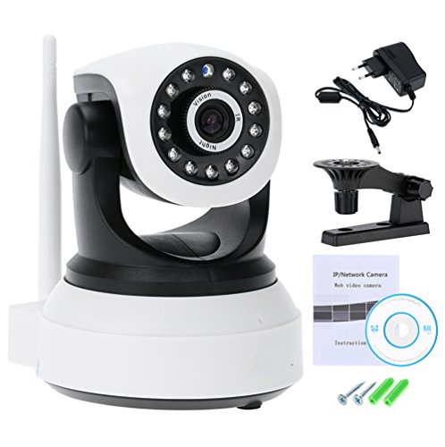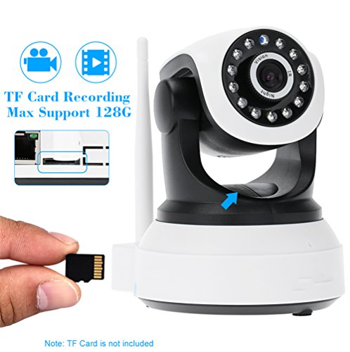 -. Feature : ★LARGE COVERAGE:Pan 355°wide-angle advanced glass lens combined with Tilt 60° rotation range create a large coverage for home suveillance.The Smart Home Wirelss IP Camera Built in 10 infrared lights,which allow IR distance reach 10 meters. / ★TWO WAY AUDIO AND CONVENIENCE STORAGE(LOOP RECORDING):This wireless camera built in Microphone and speakers. You can talk and listen to your family or friend on mobile device.Record video into SD card or PC computer,delete old recording video automaticlly when it is full Max 128GB SD card. / ★MOTION DETECTION:The Smart Home Wireless IP Camera can effectively identify static or dynamic picture frame,when the dynamic screen appears.The system automatically grab image uploaded to the specified mailbox of FTP server,and start alarm. / ★MULTI-PLATFORM REAL-TIME VIEWING:The Smart Home Wireless IP Camera is not only support windows computer system monitoring,but also support the iphone,android smartphone up to 4 clients to watch at the same time. / ★24-MONTHS WARRANTY:Offers you a 100% money back satisfaction guarantee within 1 year!Respond within 24 hours, If there are any question.Without worry about.