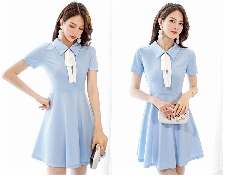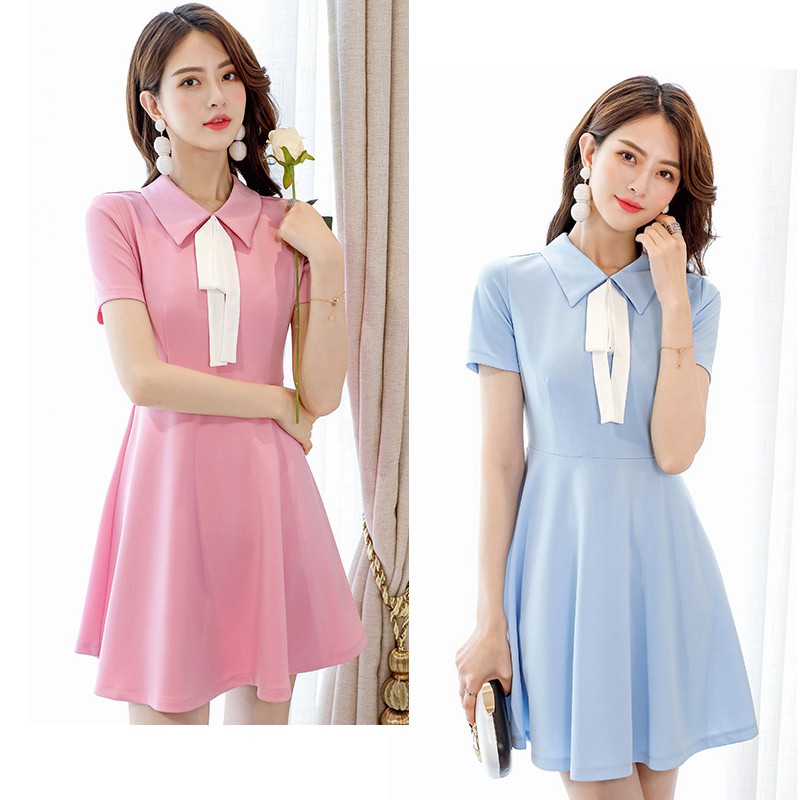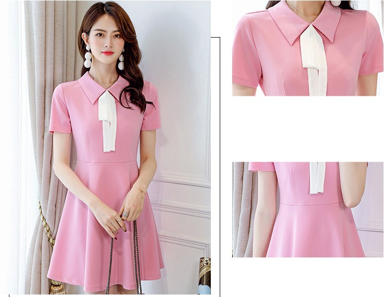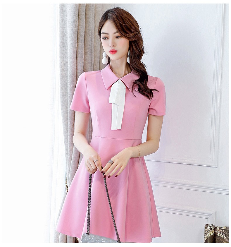 襟付き・ホワイトボウタイデザインの半袖・ひざ上丈ワンピース♪