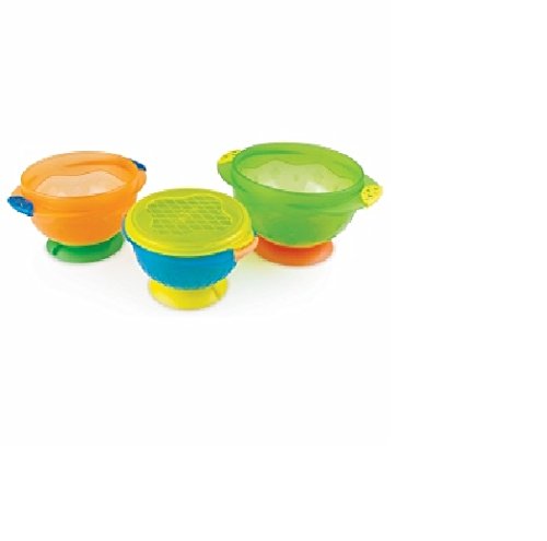 • Comes with 3 bowls and 1 snap-tight lid - Suction base prevents spills