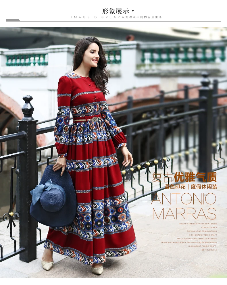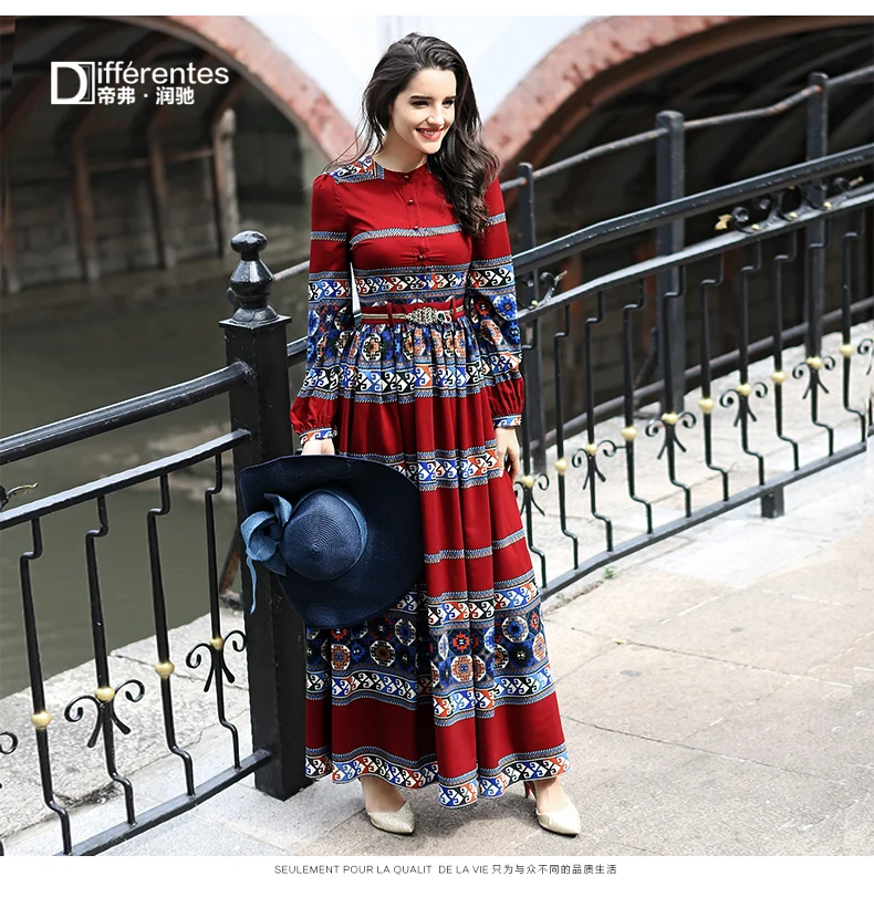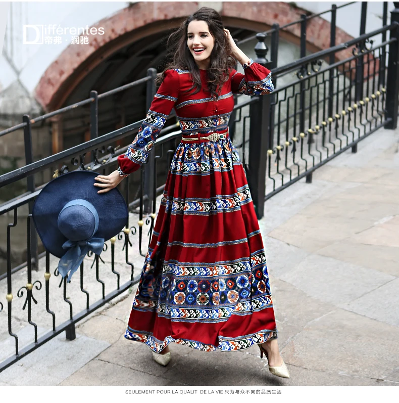 ヴィンテージドレス春夏新有名なカジュアルロングスリーブパーティー服シフォンプリント高級マキシドレススリムウエスト