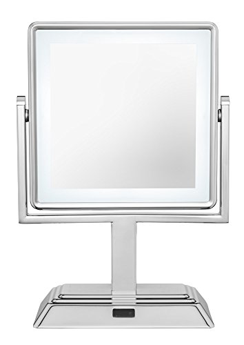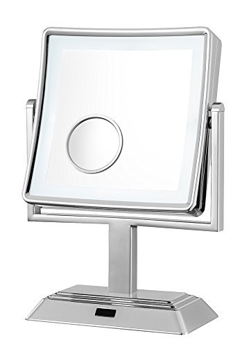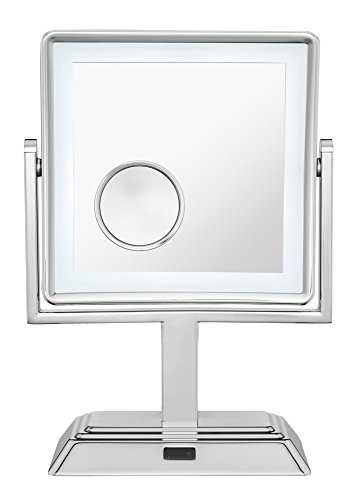 This Conair Double-Sided Lighted Makeup Mirror - Lighted Vanity Makeup Mirror has LED lighting and rotates 360-degrees for regular viewing or 5x / 10x spot magnification