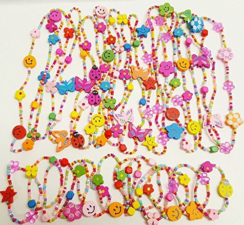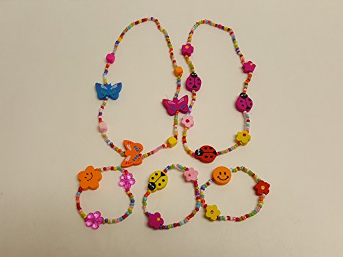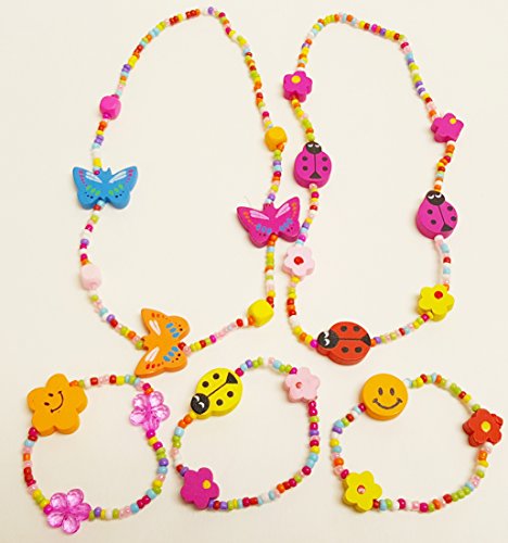 -. Feature : 12 SETS per order / assorted colors plastic beads with wood charms : flowers, butterflies, ladybugs, stars and more / Matching colorful wood bead Charm necklace and bracelet sets. Large wooden bead charms add extra style! Assorted styles include flowers, butterflies, ladybugs, stars and more. Child size. Twelve sets per unit. 24 pieces total. / Charms on each are wooden, and measure from .25 inches to .75 inches / stretchy bracelets and necklaces will fit any size