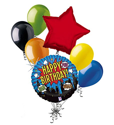 -. Feature : 1 - 18" "Happy Birthday ... Pow ... Wham ... Bam" Holographic Superhero Round Balloon / 1 - 18" Red Star Balloon / 5 - 11" Mixed Latex Balloons (Lime Green, Black, Orange, Yellow, Blue) / Packaged & Shipped together / Helium and ribbons are not included