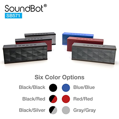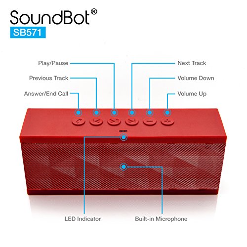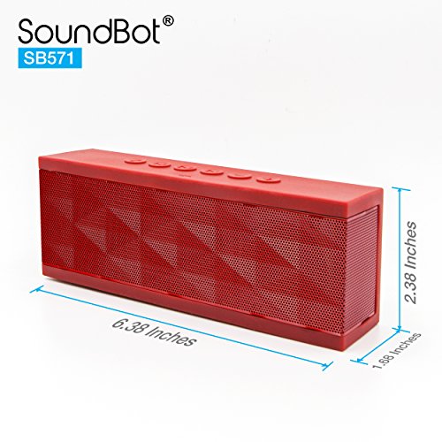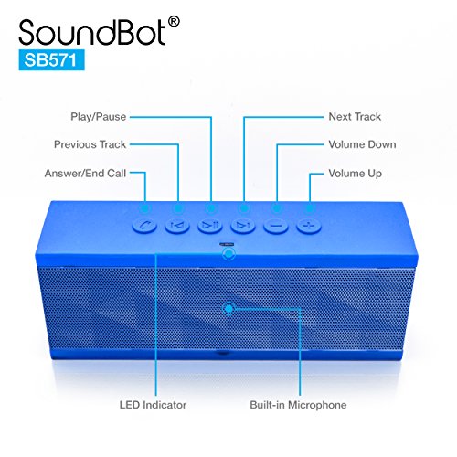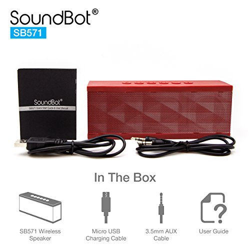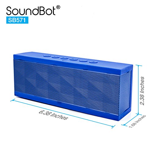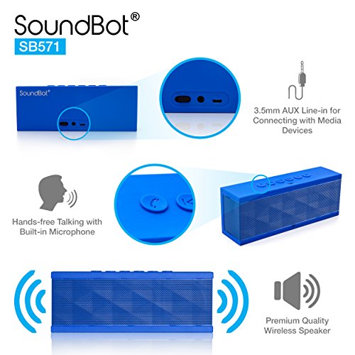 -. Binding : Wireless Phone Accessory -. Brand : soundbot -. Feature : Crystal clear deep bass 6W + 6W HD loud speakers with 40mm premium drivers for both active outdoor and indoor use. / Built-in 3.5mm audio line in and 1000mAh rechargeable battery allow SB571 to connect to media devices WITH OR WITHOUT Bluetooth capability. / Bluetooth 3.0 audio wireless connectivity with seamless streaming, 10 hours of playback time, from 33 feets of distance / 2 x 40mm speaker driver output with deep bass and crystal clear sound / Fashionable and stylish design with solid performance and universal compatibility for Android, iPhone, iPad, tablets, smartphones, iPods, MP3, MP4, radio players, and other Bluetooth enabled digital players or media devices with aux port. -. Label : SoundBot -. Manufacturer : SoundBot -. PackageQuantity : 1 -. ProductGroup : Wireless -. ProductTypeName : WIRELESS_ACCESSORY -. Publisher : SoundBot -. Studio : SoundBot -. Title : SoundBot SB571 Bluetooth Wireless Speaker 12W Output HD Bass 40mm Dual Driver Portable Speakerphone for 12Hr Enhanced Music Streaming & HandsFree Calling, Built-in Mic, 3.5mm Line-In