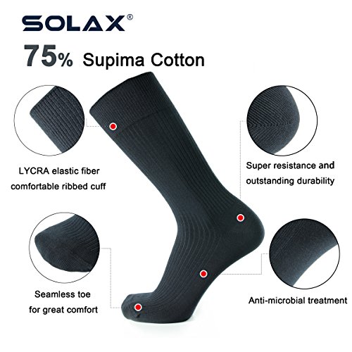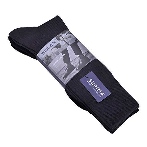 -. Binding : Apparel -. Brand : SOLAX -. Color : Asst1 -. Department : mens -. EAN : 0761290359994 -. Feature : ★ QUALITY AND COMFORT PERFECTLY COMBINED - Forget about socks that are tight and uncomfortable. Say goodbye to socks that fall apart in no time! This makes them soft, durable, breathable and comfortable at the same time! Nothing less than you deserve. / ★ DESIGNED TO BE COMPRESSED & FOR ELASTICITY - Socks are designed to feature a med-compressed & elasticity to gently support and protect an Arch, Ankle, Heels and Stay up, Compressed Top Holds the sock securely on the calf. / ★ SOFT SOCKS - The process of production imparts these black athletic or dress socks high durability, improves their lustre and results in sheen appearance, improves socks resistance to mildew and increases their affinity to lint. This ensures that you get extremely good quality socks that not only look great but are excessively soft and comfortable / ★ SIZE & CARE - These socks come in a standard US SIZE that fit shoe sizes from 9-12.5. so everyone can enjoy these premium high quality socks. Please do not iron them. We also recommend gentle hand wash with cold water and no tumble dry, for these socks may shrink at high temperature. Great quality socks require the proper care! / ★ GREAT QUALITY - Carefully designed for long lasting superior quality, won't fade or misshape wash after wash. -. IsAdultProduct : 0 -. Model : solax-04-L -. PackageQuantity : 1 -. ProductGroup : Apparel -. ProductTypeName : SOCKSHOSIERY -. Size : Large -. Title : SOLAX Men's Supima Cotton Dress Socks Rib Knitting Sock 3 Pack Shoe Size 9-12.5 (ASST1) -. UPC : 761290359994