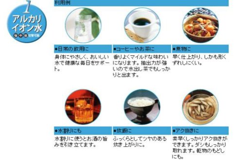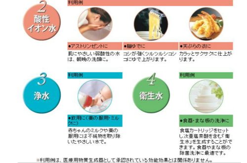 -. Feature : 医療機器の分類:管理医療機器  類別:器具器械(83)医療用物質生成器  一般的名称:連続式電解水生成器  認証取得:SJET  医療機器承認番号:21600BZZ00652000 / 製品寸法:高さ345×幅238×奥行156mm  製品重量:約7.5kg  定格電圧・定格周波数:AC100V 50/60Hz 定格入力電流:3.8A / イオン水流量:約6L/min   浄水器で除去できる成分:残留塩素、カビ臭、水中に溶けているイオン化した鉛 / 接続ホースの長さ:1.5m  使用水質:水道水などの飲用に適した水を対象。  使用可能水道圧:0.05~0.5MPa / 浄水能力:約30,000L  【安全装置】•電解トランス温度プロテクター(サーミスタ及び温度ヒューズ)•電解槽プロテクト•定格時間(生成中に放置した時の保護のため、15分連続電解すると警告音と「音声」で お知らせします)•pH10以上注意喚起(点滅表示します)•衛生水吐水警告(音声でお知らせします)•過電流保護(過電流防止、短絡保護回路)•切替コック内の精密定流量弁によって過流量を防止•切替コック内の安全弁によって本体に高水圧がかかるのを防止