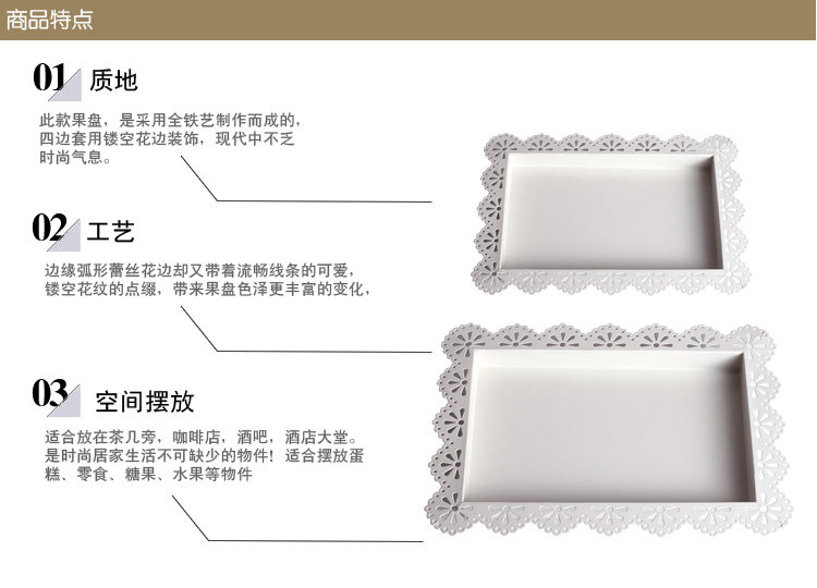 Brand: soft time Product Name: soft time fruit plate cake rack Continental Iron white rectangular dessert plate ornaments home living room made in China Item No: GT12G002AB Packaging: professional carton packaging Style: single dish (lace) Size: Large: Length 46cm wide and 31cm height 5cm; S: length 36cm width 26cm height 5cm; Weight: 0.9KG / Queen; 0.65KG / small Material: Iron Tips: Iron products more or less have small flaws, these are handmade products can not be avoided, but does not affect the use, particularly concerned about the silence after the closure of this page, please bypass, thank you for your cooperation! It is noted. Recommendation: suitable for a next coffee table, coffee shop, bar, hotel lobby, SPA health club, REF showrooms, places like courtyard. Fashion home life is an indispensable item!
