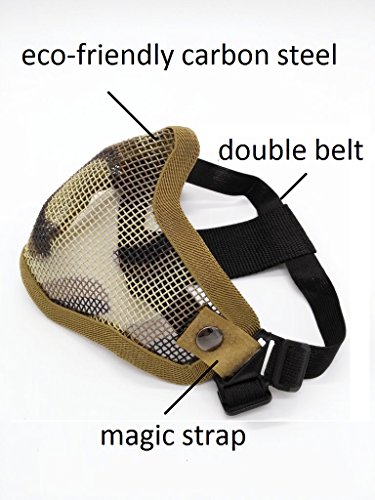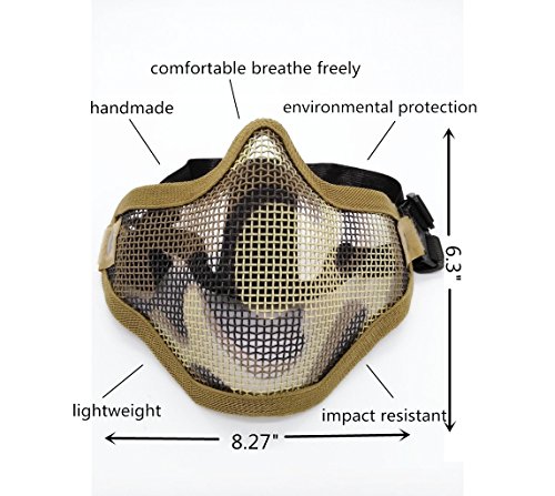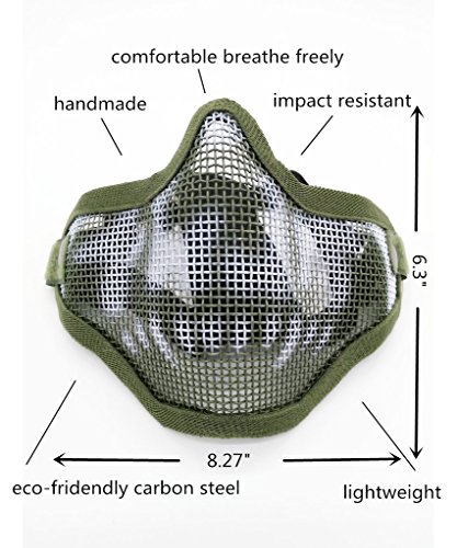 -. Feature : Applicable Scope: Great for airsoft, hunting, war game, Halloween costume, bb gun game and other purpose. / Protection: Full metal mesh face mask that provides superior protection. / Breathability And Adjustability: The mesh makes it good for breath, the side strap with adjust belt ensure the fit. / MATERIAL: The main use of high quality carbon steel. The impact resistance is strong and durable / COMFORTABLE AND LIGHTWEIGHT: The mask weighs 0.28lb, wears almost lightly on your head. Lightweight but can resistant to high impact. The mask approved the ANSIZ80.3 floor test, impact resistance of at least 700FPS.