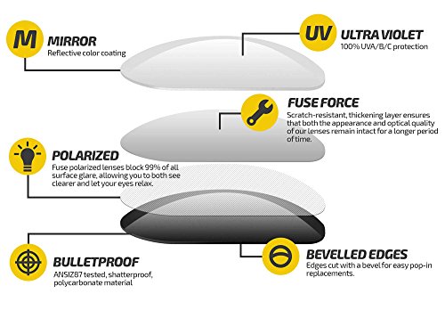 All of our lenses offer 100% UV protection, impact resistance that exceeds ANSI Z80.3 and EN 1836:2005 standards, multiple layers of the most intense and rugged hard coatings and hydrophobic coatings to keep your lenses clean and protected and, of course, a 100% money back satisfaction guarantee.
