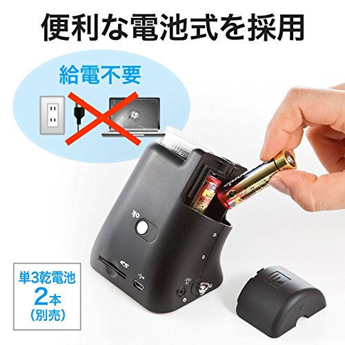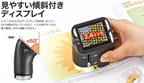 約50°の傾斜付きディスプレイで見やすく、2.4インチの大きめの液晶画面で撮影した画像や動画をその場で確認できます。単三乾電池2本で可動します。
