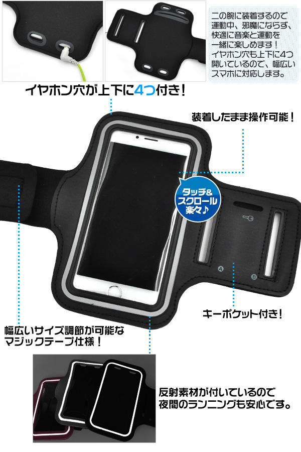 エクササイズやジョギングに便利なスマートフォン用アームバンド。二の腕に装着するので運動中、邪魔にならず、快適に音楽と運動を一緒に楽しめます!