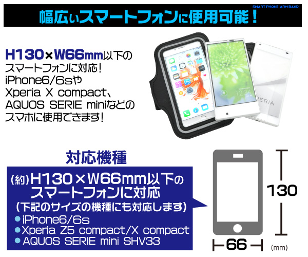 H130×W66mm以下の スマートフォンに対応!iPhone6やXperia X compact、AQUOU SERIE miniなどのスマホも使用できます!
