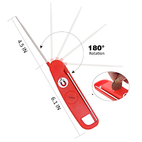 - ❤ LIGHTWEIGHT, DURABLE with Long probe: The instant read BBQ meat thermometer is made of High quality Food-safety ABS durable plastic case and 4.5 inch 304 STEEL stainless probe for both home and professional use. The cooking thermometer has got NSF, CE and ROHS certification,only 1pc CR 2032 lithium coin battery needed (included).