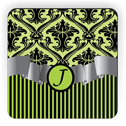 Rikki Knight Letter "J" Initial Lime Green Damask and Stripes Monogrammed Design Square Fridge Magnet