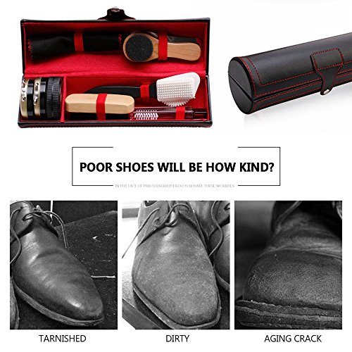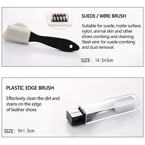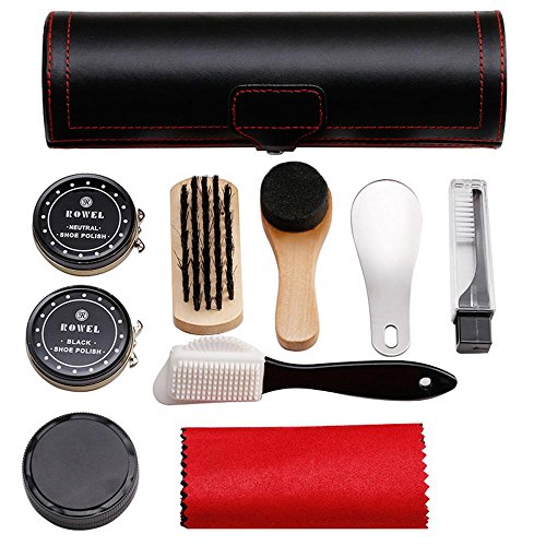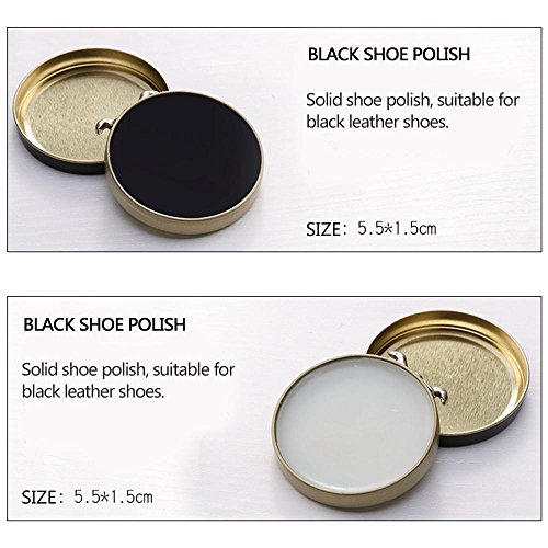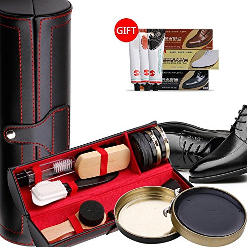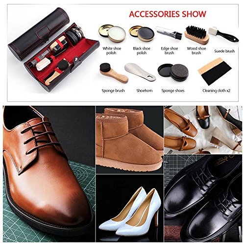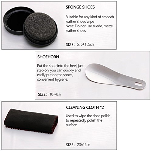 Our Shoe Shine Kit is Super convenient and practical. 13 in 1 Design including:shoe polish*5(White solid shoe polish * 1,black solid shoe*1,waterproof Highlight shoe polish*3)? ; Shoe polish sponge*1(5.5*1.5cm) ; wooden brush*1(8.7*3cm) ; wooden handle sponge brush*1(10*2cm) ; shoehorn*1(10*4cm) ; suede brush*1(14.5*3cm)? ; edge brush*1(9*1.5cm) ; Durable Shine Cloth*2(23*12cm) ; PU leather compact case*1(24*7cm) ; ????????? How to use: 1.Remove the laces from your shoes before starting to polish them. 2.Clean the dirt and debris from your shoes. Debris can be embedded in leather if it is not cleaned off prior to polishing. For best results, it is recommended to clean your shoes with a cleaning wipe or damp rag and allow them to dry before applying polish. 3. If your shoes are dry cracked, apply a leather conditioner (not included). Just as your own skin can crack and become dry, so can leather. Apply the conditioner with a clean cotton cloth and allow the shoes to completely dry before proceeding to the next step. 4.Apply polish evenly to the entire body of the shoe. A thin layer of polish will do it, but you need to make sure that it is evenly applied to avoid spotting on the leather. Let the polish dry before proceeding to the next step. Shoe polish should be applied with a clean cotton rag or the foam applicator. Use the smaller brush to rub polish deep into the area between the heel shoe uppers. 5.Buff your shoes until they shine: First use the large brush; then use the buffing cloth in a brisk side to side motion for the final shine. 0 |