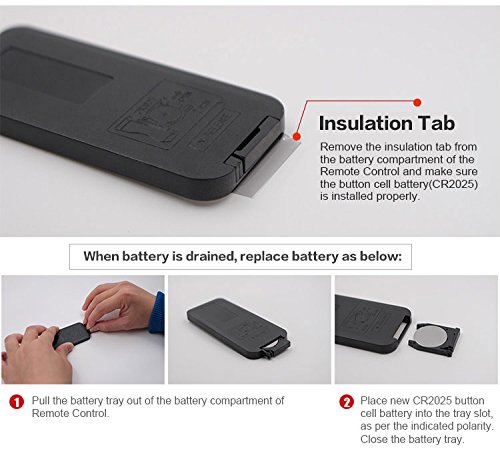 Instruction Information About the Remote Control: Remove the insulation tab from the battery compartment of the Remote Control to activate the battery and make sure the button cell battery(CR2025) is installed properly.