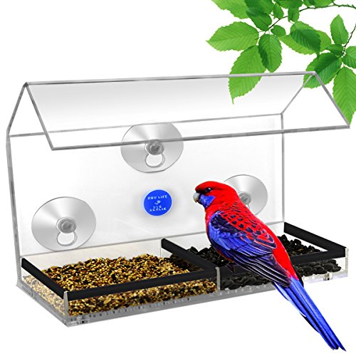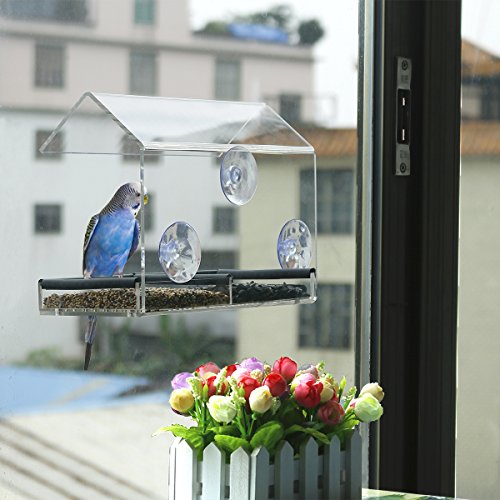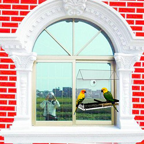 - NEW STYLE - The Window Bird Feeder is made of clear sturdy acrylic,different from traditional bird cage.The perch design with padded grip on the seed tray means birds will thank you and stick around longer.The top cover piece protects bird and seeds from rain and snow.The house shape design is more warm and elegant.