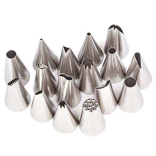 - WHAT'S INSIDE? This kit consists of the 16 MOST POPULAR types of Cake Decorating Tips, 1 reusable 14" food grade silicone pastry bag with a hook for easy drying, and 1 plastic coupler for connecting the bag with any tip.
