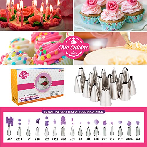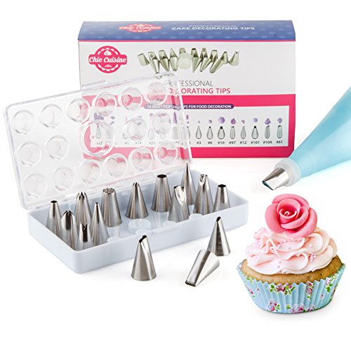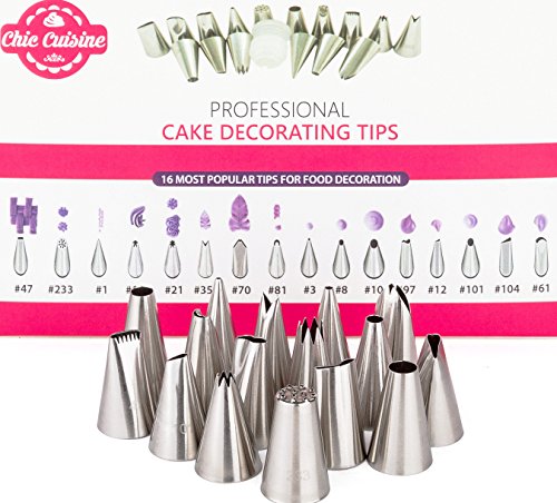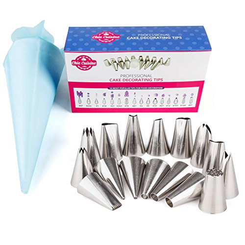 Chic Cuisine 18 Pcs Cake Decorating Tips Set in a GIFT BOX incl. 16 Professional Quality Stainless Steel Icing Piping Frosting Nozzles, 1 Coupler and a BONUS 14" Silicone Bag, for Kids and Beginners