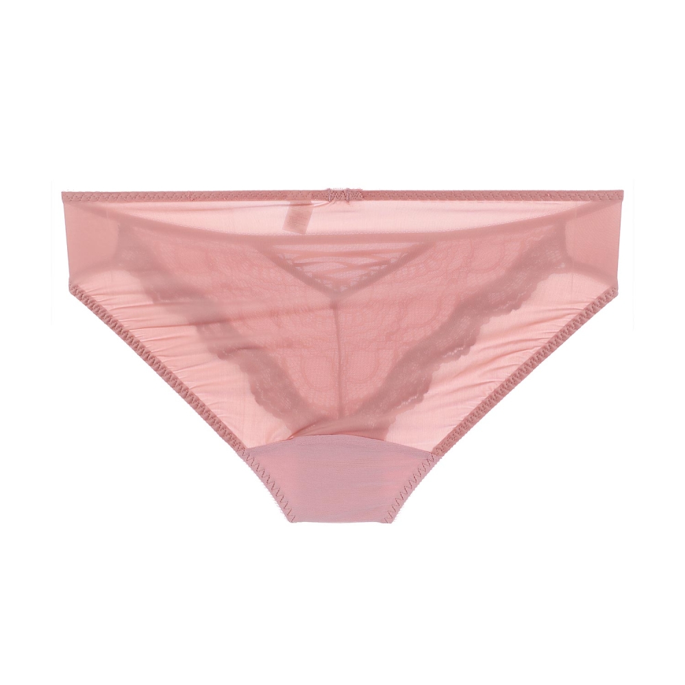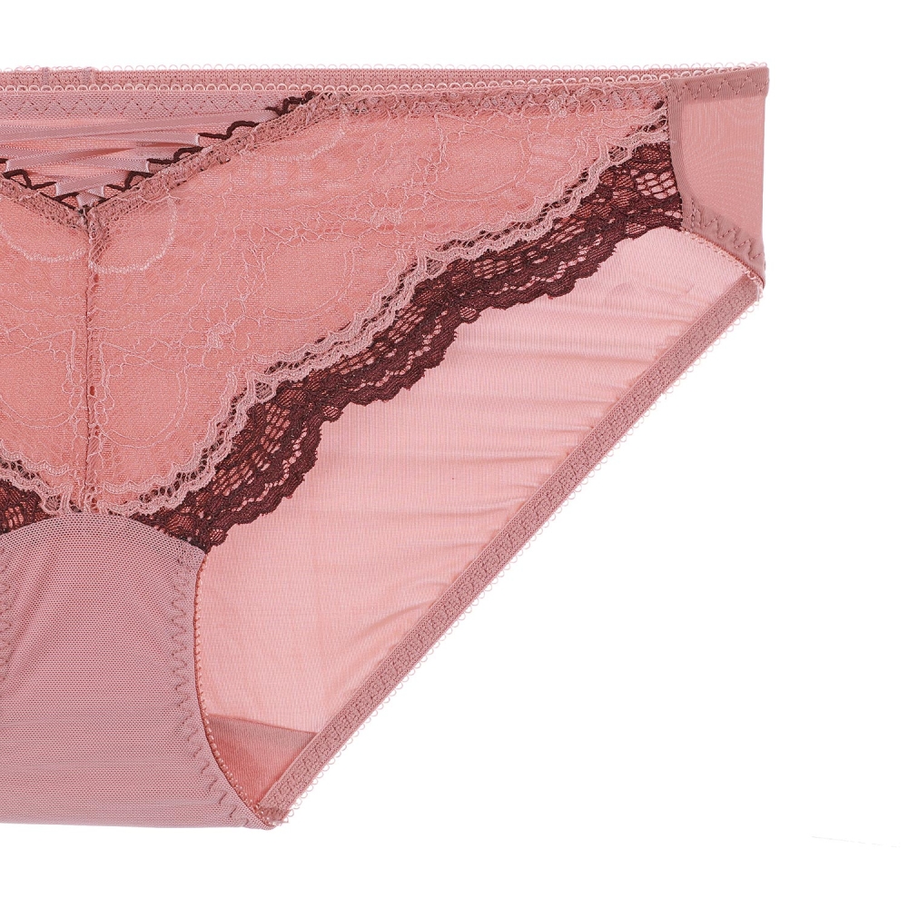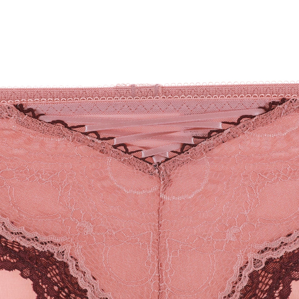 그라데이션 쉐도우를 하듯이 핑크브라운 컬러와 와인컬러를 투톤으로으로 매치한 레이스 삼각팬티. 앞중심 주자스트링 장식 포인트.