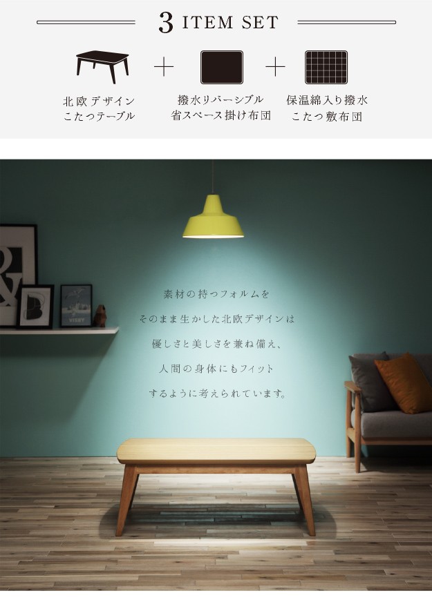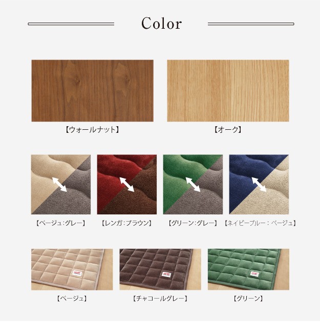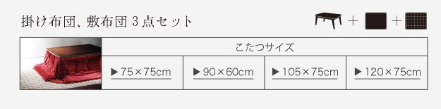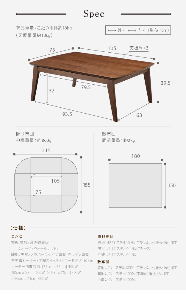 ※メーカー直送のため代金引換はお受けできません。※沖縄・一部離島は別途送料がかかります。お見積もりいたしますのでお問い合わせ下さい。【セット構成】こたつ本体x1掛布団x1敷布団x1【カラーバリエーション】■こたつ本体ウォールナット(ブラウン)・オーク(ナチュラル)■掛布団レンガxブラウン・ベージュxグレー・グリーンxグレー・ネイビーブルーxベージュ■敷布団ベージュ・チャコールグレー・グリーン【仕様】■こたつ本体天板:天然木化粧繊維板(ウォールナット/オーク)幕板・脚部:天然木(ラバーウッド)石英管ヒーター(400W、中間スイッチ式)◎一部組立■掛布団/敷布団表地:ポリエステル100%裏地:ポリエステル100%撥水・防汚加工【サイズ】■こたつ本体幅105x奥行75x高さ39.5cm重量:約18kg天板サイズ:幅105x奥行75cm・厚み30mm・約10kg■掛布団サイズ:215x185cm・中綿:約860g■敷布団サイズ:180x150cm・中綿:約810g株式会社ナカムラ(I-5700384)